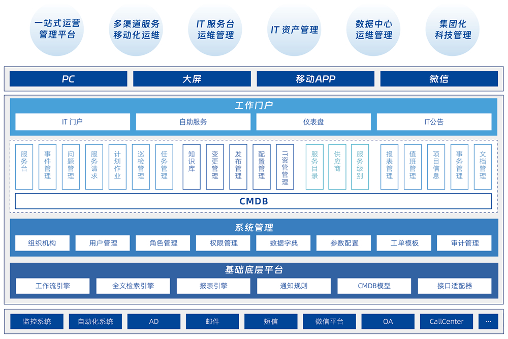提供一站式 IT 服务管理咨询及解决方案,,,,为 IT 服务数字化运营管理赋能。。。整个系统基于 ITIL 最佳实践和 ISO20000、、、ITSS 等标准的 IT 管理的「ERP」,,,致力于帮助金融、、、、政府、、、、大中型企业等行业客户快速实现自助服务台、、、事件管理、、、IT 资产管理、、、、SLA 管理等核心流程,,,构建以服务为导向的 IT 服务管理体系,,有效提升 IT 服务效率和效果,,,,实现 IT 服务的标准化、、可视化、、、流程化、、移动化和精细化管理。。